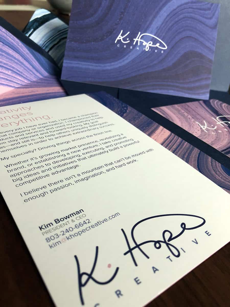 K. Hope Creative is a boutique consulting firm dedicated to the core belief that creativity is the single most powerful tool for improving your business, organization, or life. The principal, Kim Bowman, wanted a personal touch to the way she deals with clients. To that end, we created a logo based on her handwriting that brings together the boutique feel with that one-on-one business ethic.